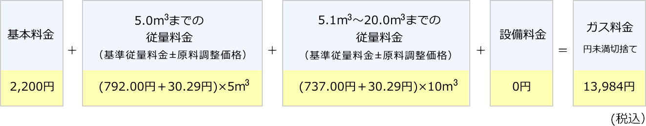 毎月のガス料金(税込) = 基本料金 + ( 基準従量料金 ± 原料費調整価格 ) × ご使用量 + 設備料金